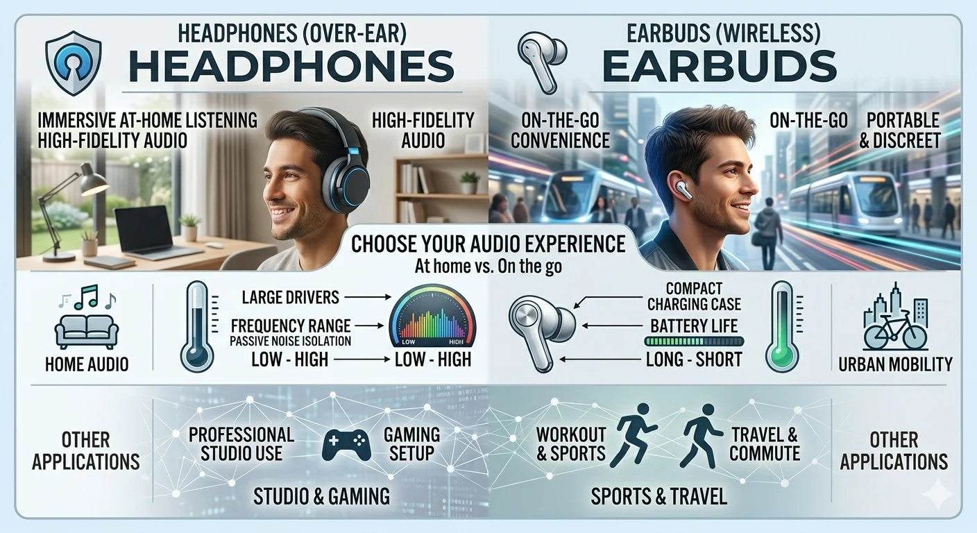 💡 Memory Hack: Think “big for home, small for travel” — headphones = big, earbuds = small.